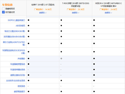 汽车智能科技的应用也充分体现在安全配置方面。三款SUV均配置了ABS防抱死、EBD制动力分配、EBA刹车辅助、TCS牵引力控制、ESP车身稳定等安全系统。哈弗F7、CR-V还集成了ACC自适应巡航、LCA并线辅助、LDW车道偏离预警、TSR交通限速标志智能识别、360度全景影像等黑科技配置,主动安全配置明显比探歌更丰富。三款SUV中,哈弗F7还独有CTA倒车侧向警告、DOW开门预警系统,相比之下,20.38万元的探歌,就显得很小气了。