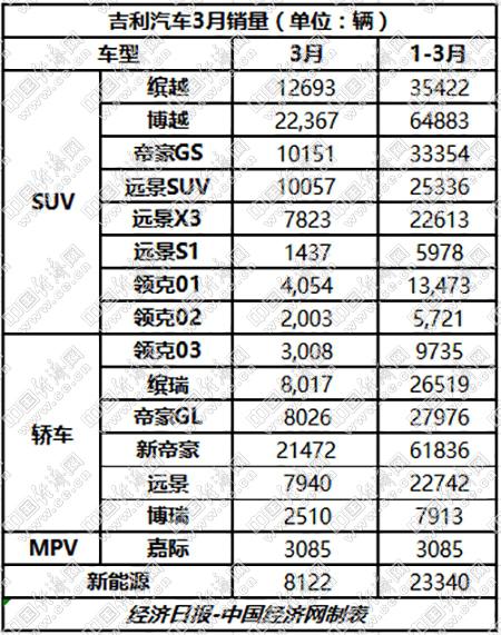 在传统业务板块持续发力的同时,吉利新能源和MPV新产品序列也为其3月销量作出一定贡献。其中,吉利新能源汽车3月总销量为8122辆,首款MPV车型嘉际销量为3085辆。