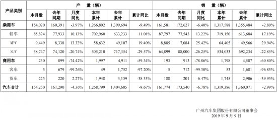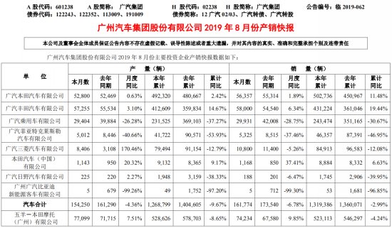 昨日,广州汽车集团股份有限公司(A股:601238,H股:02238)公布了2019年8月份产销快报,整体产销数量保持稳定,数据显示,8月份其汽车产销量分别为154250辆、161774辆,同比下降4.36%和6.78%。前8月产销量分别为1268799辆、1319386辆,同比下降9.67%和2.99%。广汽本田、广汽丰田依然是广汽集团的支柱单位,前八月销量合计占集团总销量的70.79%。另外加上本田中国,这三家单位销量月度同比与年度累计同比数据均为正。