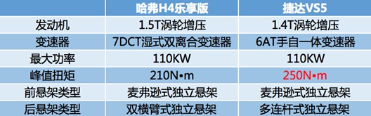 动力是SUV对比的永恒话题,在满足国六排放标准前提下,尽可能提高动力属性是当下所有车企努力的目标。哈弗H4乐享版搭载1.5T发动机,最大功率110KW,峰值扭矩210N·m。配备曾获得“世界十佳变速器”殊荣的7DCT湿式双离合变速器,激烈驾驶时升降挡速度快,变节奏驾驶也不会显得迟滞,换挡体验和燃油经济性明显比捷达VS5的AT变速器更胜一筹。