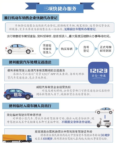 公安部交管局局长李江平介绍,今年上半年,公安部推出实施深化公安交管“放管服”改革10项便民利民服务举措,推进在机动车销售企业设立交通管理服务站,发放临时行驶车号牌。此次改革,公安交管部门进一步提供便捷服务,推行机动车销售企业快捷代办登记,群众在机动车销售企业即可完成购车登记全部环节。