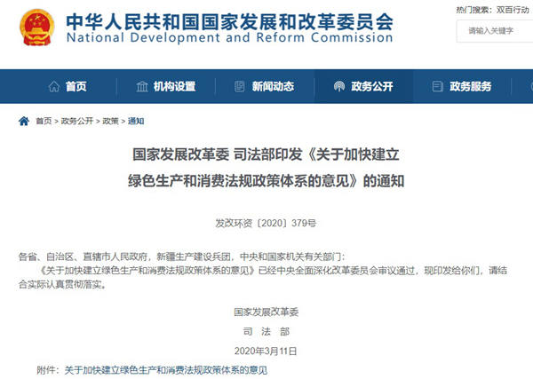 人民网北京3月18日电(王紫)17日,国家发展改革委和司法部联合印发《关于加快建立绿色生产和消费法规政策体系的意见》(以下简称“意见”)指出,要完善机动车报废更新政策和新能源汽车推广机制等,加快建立绿色生产和消费法规政策体系。