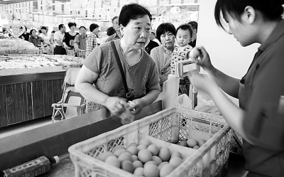据河南省商务厅监测,5月末全省60种重要生活必需品价格,同比持平或下降的占57.4%,上涨的占42.6%。图为5月25日,市民在郑州一家大型超市内排队选购新鲜鸡蛋,当日郑州市场鸡蛋零售价每斤5.5元,创近几年新高。