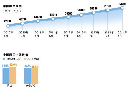 聊QQ、刷微博、逛淘宝、团购……拥有一台智能手机,越来越多的事情可以动动手指就解决。21日,中国互联网信息中心发布的《第34次中国互联网络发展状况统计报告》显示,截至6月,我国网民上网设备中,手机使用率达83.4%,首次超越传统PC使用率(80.9%),网友们调侃表示,这是低头族的胜利。