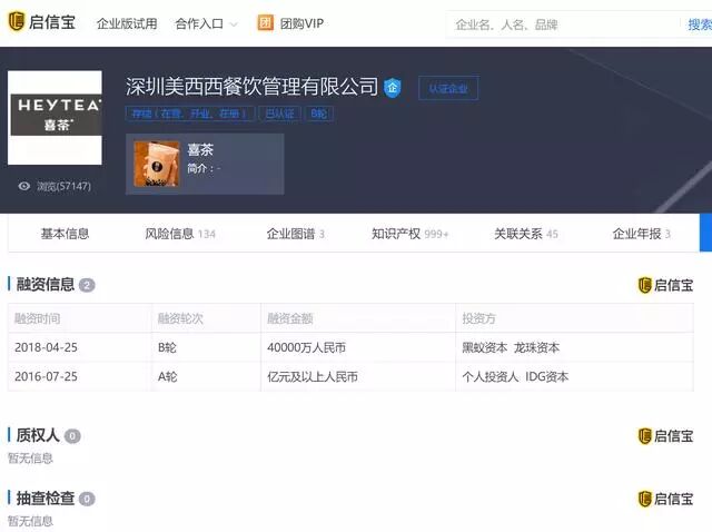 根据启信宝的数据显示,2016年8月份,今投与IDG资本向喜茶投资1亿元,今投实控人何伯权因此获得喜茶隶属的深圳美西西餐饮管理有限公司(下称"美西西餐饮")9.31%股权。2018年4月份,黑蚁资本和龙珠资本在B轮入场,两家机构向喜茶投资共计4亿元,分别获得美西西餐饮0.9%和7.75%的股权。在这里有必要说一下,龙珠资本就是大名鼎鼎的美团点评旗下的投资公司,龙珠资本的投资,可以当做美团点评对于喜茶的看好。两轮融资后,创始人聂云宸持股比例稀释至49.72%,仍然为美西西餐饮的实际控制人。