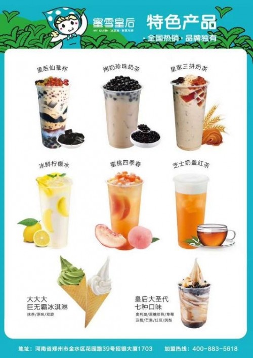 蜜雪皇后拥有七大系列,数十种特色单品,能够充分满足客户期待。其研发团队,定期深入市场调研,打造更具有创新精神,更具有市场竞争力的优质产品,始终确保产品品质引领市场潮流,让全国各地门店持续增值。