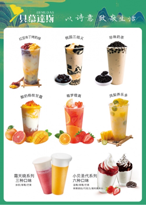 贝慕达斯成立于2010年,是一个集古典诗意与现代时尚为一体的新中式茶饮品牌。贝慕达斯认为“中式茶”才是茶饮的“灵魂”所在。它以唐诗宋词为基底,将“新中式”茶文化与新鲜水果结合,加入新西兰进口奶源,让传统文化与西方文化相互碰撞,形成了自身的特色文化标志。
