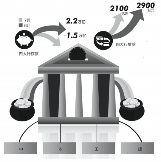 6月的存款集结后,7月的存款量增幅经历“过山车”。数据显示,6月份刚大增2.2亿元存款的四大行,当月金融机构整体本外币存款大增3.95万亿。然而仅时隔一个月,7月四大行存款负增长约1.5万亿。
