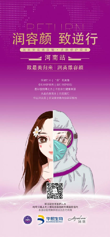 而华熙生物与中国整形美容协会共同发起的“润容颜 致逆行”全国联动性大型公益活动,同样是在利用自己的行业优势,为抗击疫情尽一己之力,真诚守护像邵护士一样,在抗疫期间容颜遭受到损伤的白衣天使,因此在活动开展期间,特为广大白衣天使奉上“润致-含利多卡因玻尿酸免费注射”以及“皮肤修护项目无偿体验”的温情福利,希望疫情过后,摘下口罩的白衣天使们脸上能够绽放出健康、美丽、快乐的笑容。