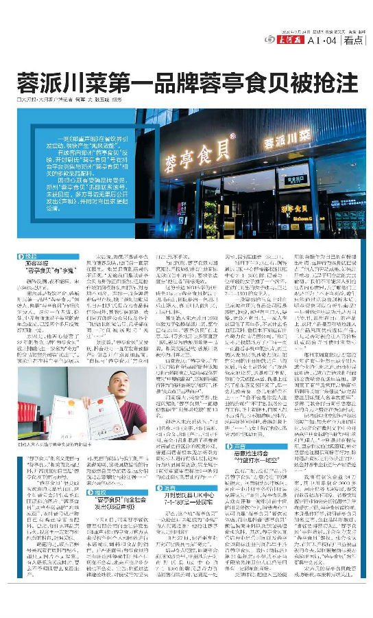 本报9月24日刊登在A04版的《蓉派川菜第一品牌蓉亭食贝被抢注》报道,在社会上引起极大反响。