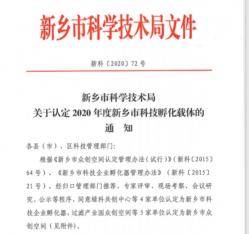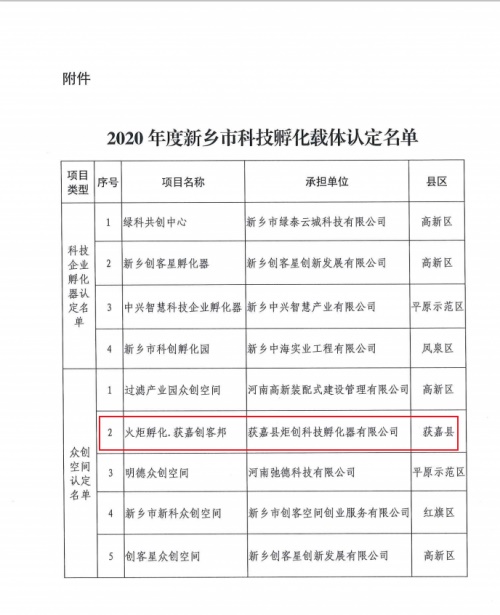 近日,新乡市科技局公布2020年度认定市级众创空间名单,2020年10月-12月,根据《新乡市众创空间认定管理办法(试行)》(新科[2015] 64号)、《新乡市科技企业孵化器管理办法》(新科 [2015]21号),经归口管理部门推荐、专家评审、现场考察、会议研究、公示等程序,火炬孵化·获嘉创客邦认定为新乡市众创空间。