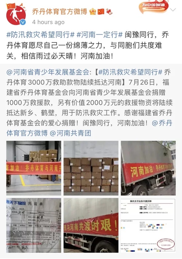 (乔丹体育向河南捐赠1000万元现金及2000万元物资)