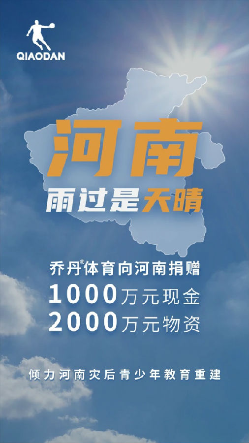 乔丹体育,一个始终关怀儿童及青少年的体育发展的民族品牌,其工作人员在紧急筹备物资的同时,实时对接河南省青少年发展基金会(下面简称河南青基会),希望助力受灾地区青少年学子的学业、生活能早日恢复常态。截至目前,河南青基会已收到乔丹体育的爱心捐赠1000万元,并向福建省乔丹体育基金会表达感谢——闽豫同行,河南加油!