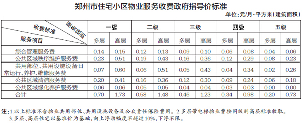“郑州市有4300家物业小区,每年有新建小区八九十家。”郑州市房管局物业处处长程建颖介绍,有物业管理公司900多家,过去是按物业公司的等级,对多层和高层制定收费标准。根据老的办法,物业收费标准高层分为四级,从1.1元到0.64元不等;多层分为五级,从0.38元到0.15元不等;可以上浮20%。