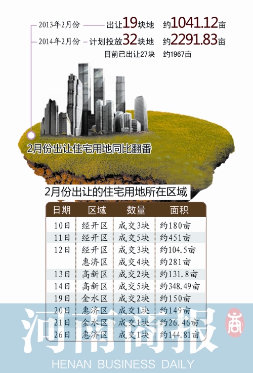 具体情况是,2月10日,经开区成交3块,约180亩。11日,经开区成交5块,约451亩。12日,经开区成交3块,约104.5亩;惠济区成交4块,约281亩。13日,高新区成交2块,约131.8亩。14日,高新区成交5块,约348.49亩。19日,金水区成交2块,约150亩。20日,惠济区成交1块,约149亩。21日,金水区成交1块,约26.46亩。26日,惠济区成交1块,约144.81亩。