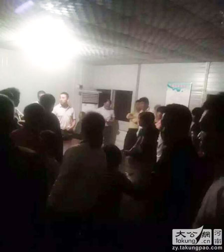 据介绍,在民工自发到政府讨薪后,9月18日,安信公司派去两名代表到濮阳五洲城售楼部协商付款结算问题,“从早上9点到夜晚9点,一直限制我和另一名同事的人身自由,派人把我们看在屋里,出去上个厕所都有一二十人跟着。”安信公司朱经理向记者描述称,“经过四次报警,清河头乡派出所两次出警,晚上9点多才让我们离开。”