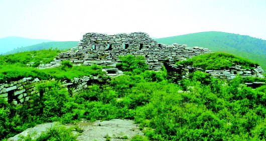 在这片核心区域稍向东的城中位置,建有四间大型石屋,这四间石屋孤立高耸,这应当是全城堡的首脑机关或指挥机关。站在这四间石屋的屋顶向周围望去,只见四野青山连绵,空中的苍鹰盘桓飞翔,齐长城从南面的山峰蜿蜒而来,穿过杜庄古城堡后继续沿山势向北逶迤而去,犹如苍龙,难见其头,更不见其尾。走出核心区后继续向西,便到了城堡最西面的一道城墙了。