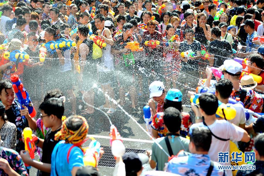 在泰国曼谷,人们参加泼水狂欢活动庆祝宋干节。(图源:新华社)