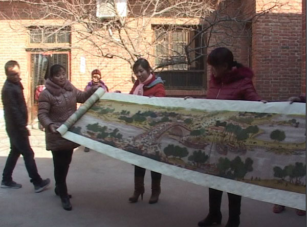 3月6日,记者见到赵贵华时,她正坐在自家院子忙活着绣她的另一幅十字绣新作,见有人来访,赵贵华赶紧拿出她引以自豪的“大作”。她说,这幅《清明上河图》长6米,宽80厘米,采用满绣的针法绣出。