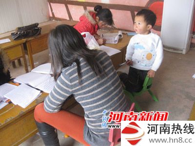 在李五辈筹建的村幼儿园里,老师们周末加班,有一位小朋友在一旁玩耍。