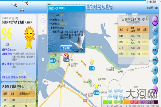 从2014年新年的第一天起,市民登录三门峡市环境保护局官网(http://www.smxhb.gov.cn/),在首页左上方会发现一个“空气质量实时报”栏目,从直观上,能看到各个站点的AQI(空气质量指数)值、首要污染物、污染类别,还有对市民温馨的健康提示。
