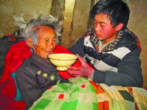 此时,午饭已经出锅,天增端着一大碗米饭和菜走到奶奶的床边,将奶奶从被窝中扶起来,一口一口地喂给她吃。
