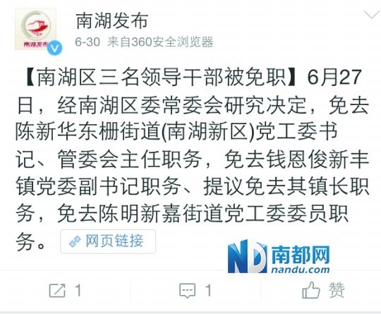 6月30日,南湖区政府新闻办官微通报了免职决定