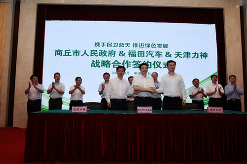 2018年9月13日,商丘市人民政府与福田汽车、天津力神战略合作签约仪式在商丘市华驰粤海酒店举行。在河南省发改委主任何熊,河南省工信委副主任郝敬红,商丘市市委书记王战营,北汽集团总经理、福田汽车集团董事长张夕勇,天津力神执行副总裁王战等领导的共同见证下,商丘市人民政府市长张建慧,福田汽车党委书记、总经理巩月琼,天津力神党委书记、董事长秦兴才分别代表三方签署了战略合作协议。