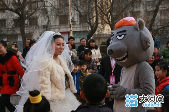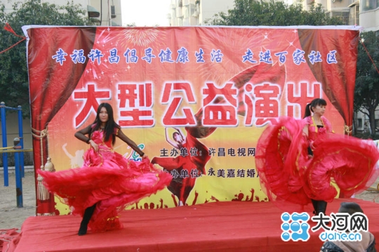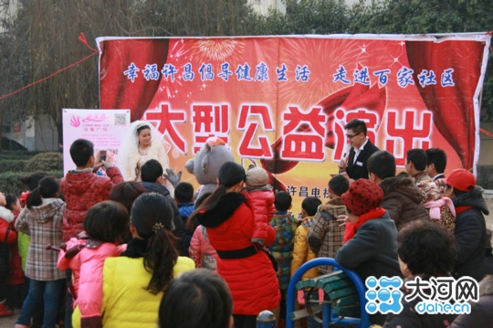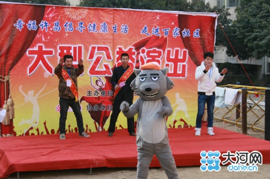 大河网讯 2014年1月5日下午,“幸福许昌倡导健康生活 走进百家社区”大型公益活动第五场在许昌毓秀新村小区拉开了帷幕。 记者发现,在活动现场动感热情的歌曲联唱 ﹑舞蹈 ﹑互动游戏﹑免费赠送大礼包等节目,带动了现场居民的参与情绪,是高潮此起彼伏。此外,一位神秘嘉宾---“灰太狼”的到来,吸引了不少孩子们的眼球,孩子们纷纷与“灰太狼”合影留念,跳舞,做游戏,是大家度过了一个轻松愉快的下午。