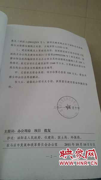 在接待记者的该镇副书记提供的一份驻马店市发改委“驻发改投资(2011)482号”文件中,市发改委核定羊册镇政府大楼的总面积是2160平方米。而已经主体竣工的大楼面积有4000平方米,几乎是驻马店市发改委核定总面积的两倍。羊册镇新政府楼所在地陶庄村群众告诉记者,当初在陶庄村盖镇政府大楼他们就反对,工程一直没能顺利进行下去,后来中央出台了八项规定,他们想盖大楼的事情会停下来,没想到后来还是大兴土木把楼盖了起来。