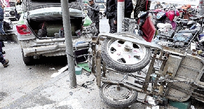 紫荆山路与商城路交叉口东南角的一辆出租车和人行道上停放的电动车都被撞坏。