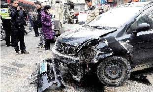 张女士、邓先生(稿费50元)昨日上午11点50分来电:紫荆山路商城路交叉口发生一起车祸,一辆失控轿车在路口来了个大拐弯,撞上多辆车,多人受伤。