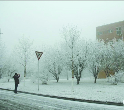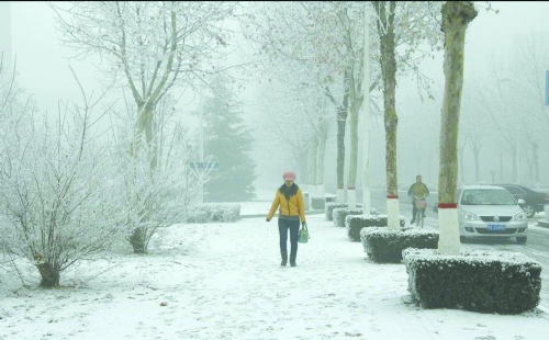 昨天早晨,有网友发微博称,郑州大学新校区下雪了。省气象局首席预报员说,这次降雪混合着雾凇。
