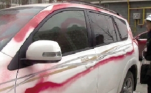 昨日清晨,家住秦岭路沁河路附近的琴海花园小区的冯女士,准备开车出去办事。但是,当她走到自己车前时,被眼前的一幕惊呆了:白色越野车被人用红漆喷成了花车,车前后左右都喷有红漆,与她的车相邻的一辆黑色大众越野车,却被喷上了白漆。