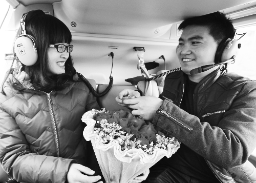 昨天下午5时许,在郑州一处空地上,刘志伟陪伴贝贝一同登机。乘直升机飞到上空,送上鲜花、拿出钻戒,刘志伟激动地开始求婚,27岁的贝贝一脸幸福,答应了。旁边,河南省电子商务协会常务副秘书长张苏丰等亲友团现场见证了这一幕。“在直升机上和女朋友度过这次情人节,非常特别。”刘志伟说,两人老家在周口农村,是高中同学,“异地恋”近10年,两人定于今年十一结婚。