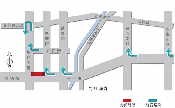 具体绕行方案:永平路至中州大道由东向北右转车辆,可以选择七里河南路、通泰路、十里铺街上白庄街、商都路转向北行驶,或选择黄河南路、农业南路向北行驶;行人、非机动车穿行中州大道下穿涵洞向西不受限制。