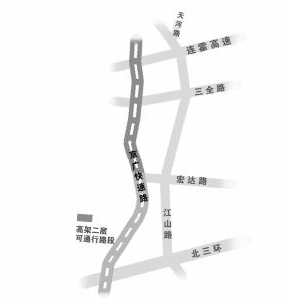 地面道路部分南向北方向行车路线可从京广快速路一期穿过北三环下穿地面道路、京广铁路下穿隧道后,沿京广快速路二期地面道路前行至新龙路转入江山路。