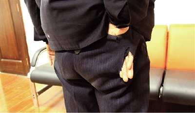 老民警的裤子口袋被划了一条长长的口子。
