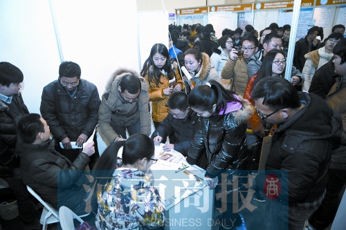 招聘会现场,不少求职者在排队写应聘表 河南商报首席记者 杨东华/摄