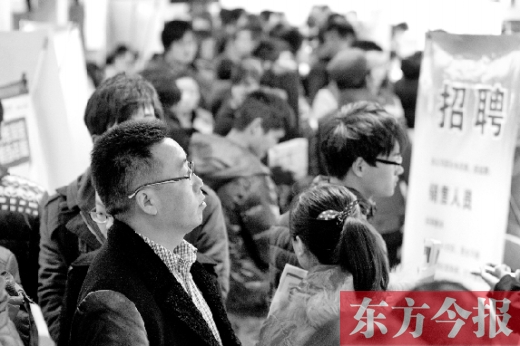 东方今报记者夏友胜(左一)在人才市场关注才市动态