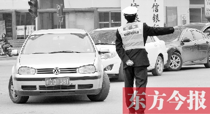 昨日,在郑州市农业路与文化路口,交巡警制止想左转闯禁行的车辆