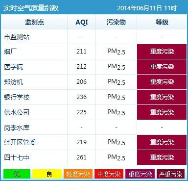 6月11日上午11时,根据郑州市环保局公布的最新数据,郑州市区9个监测点中有7个为重度污染,另外2个监测点的监测数据未能显示。