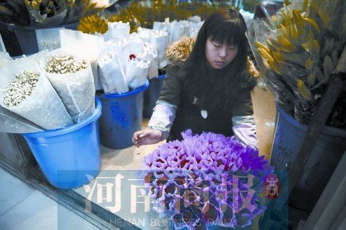 陈寨花卉市场里的行情也是如此,红玫瑰的批发价大都涨到了10元/枝,而在去年,最低售价是3元/枝,入冬后才涨到5元/枝以及后来的7元/枝。