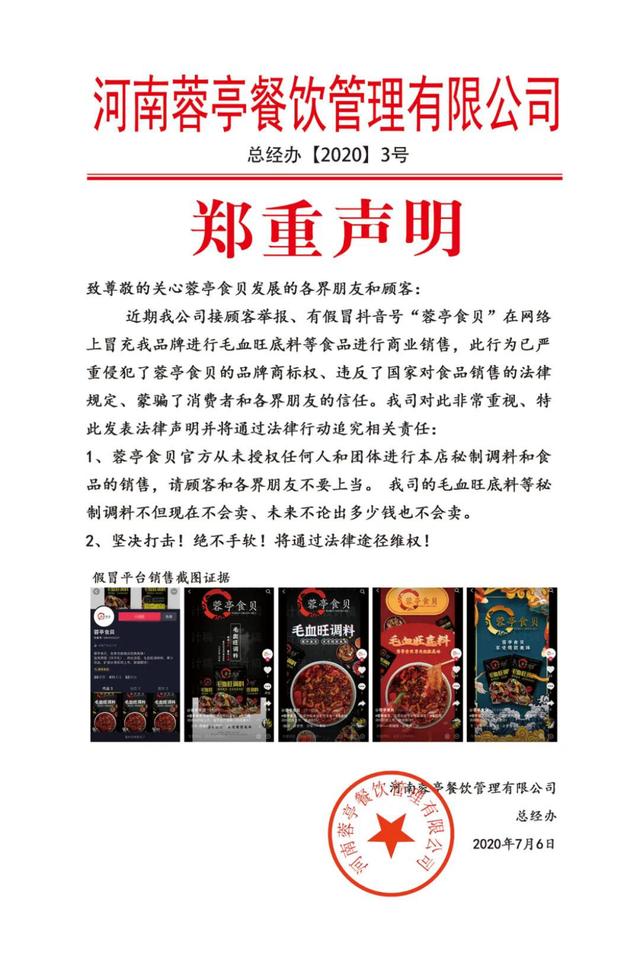 7月6日,河南蓉亭餐饮管理有限公司向全社会发出《郑重声明》:蓉亭食贝官方从未授权任何个人和团体进行本店秘制调料和食品的销售。并严正声明:蓉亭食贝的毛血旺底料等秘制调料不但现在不会卖、未来不论出多少钱也不会卖。宣告:将通过法律途径维权,对侵权行为坚决打击,绝不手软。
