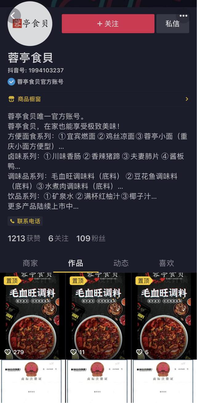 奇葩的是,该账号虽高喊着有底料有配料,却只见图片不见实物。“有人联系购买底料时,该账号要么不予理睬要么说没有生产。更可气的是,这些粗制滥造的图片涉及我们‘蓉亭食贝’十数款菜品,此行为给消费者带来了极大困扰,也对‘蓉亭食贝’品牌造成了很大伤害……”