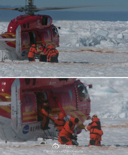 新华网快讯:“雪龙”号上的“雪鹰”12直升机已降落到被困的俄“绍卡利斯基院士”号附近,为转移船上乘客作准备。