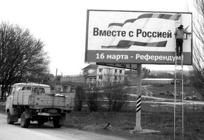 3月11日拍摄的乌克兰克里米亚自治共和国辛菲罗波尔市通往塞瓦斯托波尔市道路旁的全民公决宣传栏。新华社发