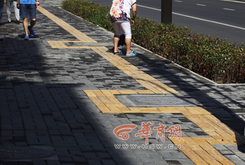 6月17日上午9时,记者在西安环城南路路南常胜街北口看到,人行道上的盲道,在16日晚大雨的冲刷下,显得比往常黄亮。而引人注意的是,本来笔直的盲道,遇到突起的井盖时就绕着走。七八米的距离,就有两处分别呈L形和T形,显得十分凌乱。
