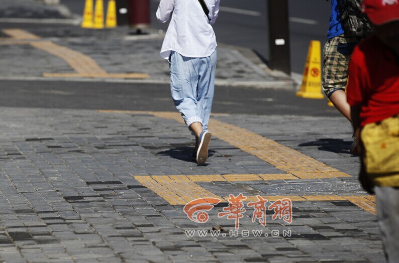2014年6月17日,西安市环城南路和平门西侧路南。 路上的盲道拐来拐去如同“贪吃蛇” (董国梁 摄 )
