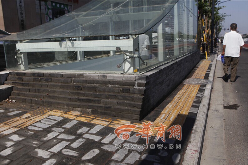 西安市第九十三中学门卫李师傅说,人行道是今年5月份修好通行的,不少来学校接孩子的家长,都说这样的盲道铺设不合理,“盲人要走,容易跌跤。”随着他手指的方向,记者看到,有一处盲道紧挨着地下通道口的墙根,而且变得很窄。附近东壕村的何大爷说,看着这盲道心里难受。图片来源:华商网